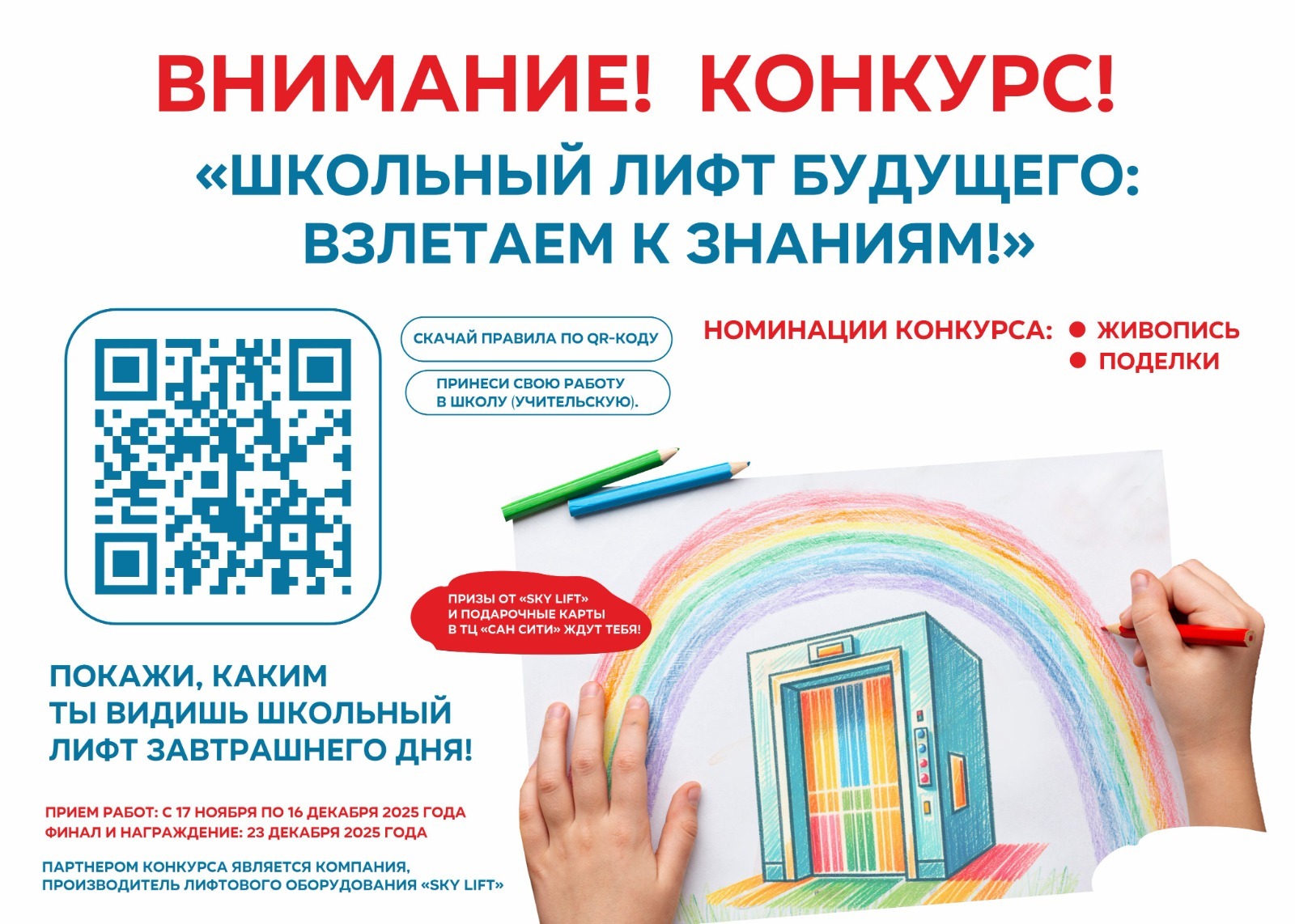 Все участники конкурса получат памятные сувениры от Sky Lift. Победители в каждой номинации будут отмечены ценными подарками.